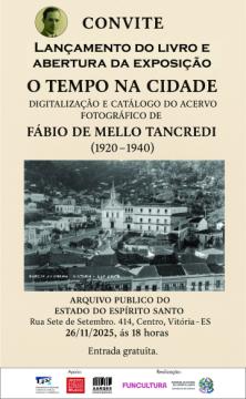 O Arquivo Público do Estado do Espírito Santo (Apees) abre suas portas para receber o público no lançamento do livro e na abertura da exposição O Tempo na Cidade: Digitalização e Catálogo do Acervo Fotográfico de Fábio de Mello Tancredi (1920–1940). O evento celebra o resultado de um amplo trabalho de organização da informação desenvolvido em parceria com a Ufes, que inclui digitalização, higienização, tratamento técnico e descrição arquivística de um conjunto de imagens que preserva parte da história urbana de Vitória no início do século XX. A programação acontece no próximo dia 26, a partir das 18 horas, com entrada gratuita.